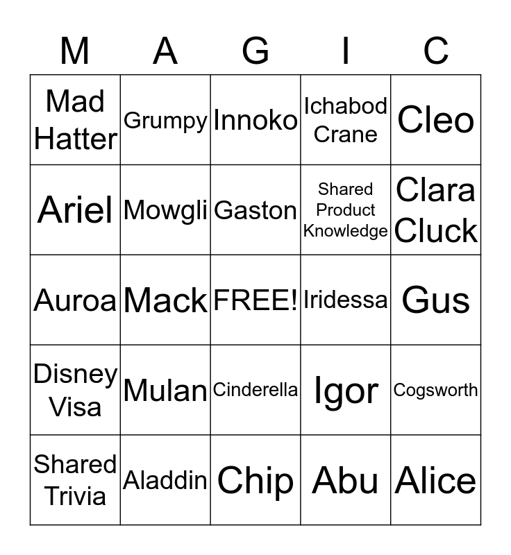 This bingo card has a free space and 24 words: Mulan, Aladdin, Gaston, Shared Trivia, Cleo, Mad Hatter, Ariel, Grumpy, Iridessa, Cinderella, Shared Product Knowledge, Auroa, Igor, Cogsworth, Mowgli, Abu, Gus, Innoko, Clara Cluck, Mack, Alice, Disney Visa, Ichabod Crane and Chip.