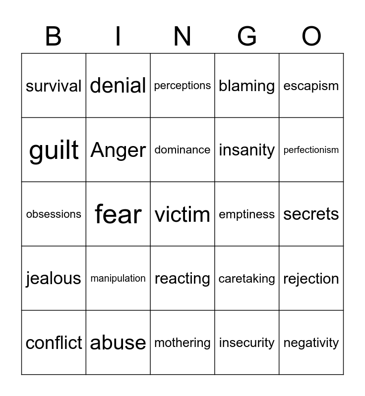 This bingo card has 50 words: Controlling, victim, martyrdom, mothering, manipulation, gossip, denial, shame, guilt, forcing solutions, Anger, blaming, rejection, caretaking, comparing, complacency, dominance, emptiness, enabling, escapism, fear, insecurity, survival, insanity, isolation, negativity, perfectionism, people pleasing, perceptions, reacting, rigidity, sarcasm, unmanageability, worry, abuse, compulsive behavior, criticism, feeling different, resentment, secrets, self-will, negative thinking, unavailability, attitudes, conflict, obsessions, self-pity, unacceptable behavior, jealous and hopeless.