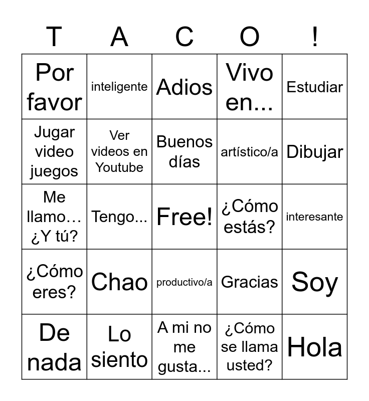 This bingo card has a free space and 24 words: Chao, Lo siento, Buenos días, De nada, Estudiar, Por favor, Jugar video juegos, inteligente, ¿Cómo estás?, productivo/a, artístico/a, Me llamo…¿Y tú?, Gracias, Soy, Ver videos en Youtube, ¿Cómo se llama usted?, interesante, Adios, Dibujar, Tengo..., Hola, ¿Cómo eres?, Vivo en... and A mi no me gusta....