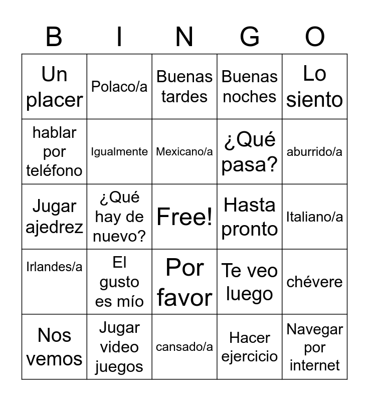 This bingo card has a free space and 24 words: El gusto es mío, Jugar video juegos, Mexicano/a, Nos vemos, Lo siento, Un placer, hablar por teléfono, Polaco/a, Hasta pronto, Por favor, ¿Qué pasa?, Jugar ajedrez, Te veo luego, chévere, Igualmente, Hacer ejercicio, Italiano/a, Buenas tardes, aburrido/a, ¿Qué hay de nuevo?, Navegar por internet, Irlandes/a, Buenas noches and cansado/a.