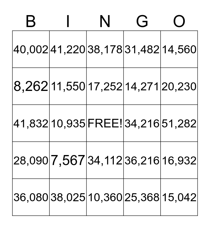 This bingo card has a free space and 24 words: 7,567, 38,025, 17,252, 36,080, 14,560, 40,002, 8,262, 41,220, 34,216, 34,112, 14,271, 41,832, 36,216, 16,932, 11,550, 25,368, 51,282, 38,178, 20,230, 10,935, 15,042, 28,090, 31,482 and 10,360.
