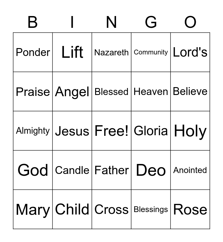 This bingo card has a free space and 29 words: Mary, Help, Jesus, Call, Ponder, Nazareth, Angel, Candle, Gloria, Child, Holy, Rose, Cross, Blessings, Believe, Elizabeth, Father, God, Lord's, Almighty, Deo, Promise, Heaven, Praise, Community, Lift, Anointed, Blessed and Earth.