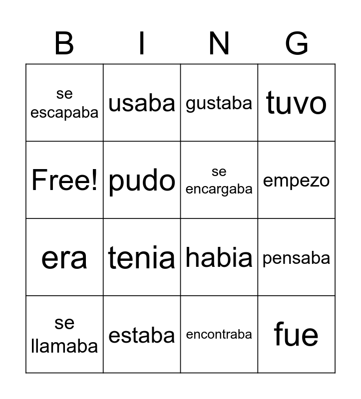 This bingo card has 16 words: estaba, pensaba, gustaba, se escapaba, era, usaba, habia, encontraba, Free!, pudo, se llamaba, tuvo, tenia, empezo, se encargaba and fue.