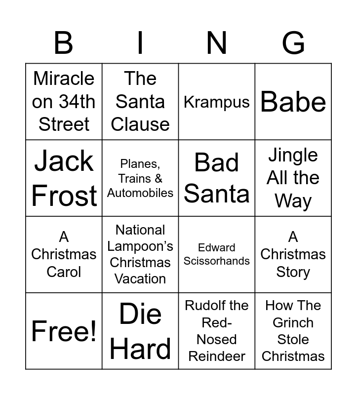 This bingo card has 23 words: How The Grinch Stole Christmas, Home Alone 2, Jingle All the Way, Pluto's Christmas Tree, Jack Frost, Miracle on 34th Street, Planes, Trains & Automobiles, The Santa Clause, Free!, Gremlins, National Lampoon’s Christmas Vacation, A Christmas Carol, Jaws: The Revenge, Frosty the Snowman, Die Hard, Love Actually, Krampus, Edward Scissorhands, Bad Santa, A Christmas Story, Babe, Rudolf the Red-Nosed Reindeer and Muppets Christmas Carol.