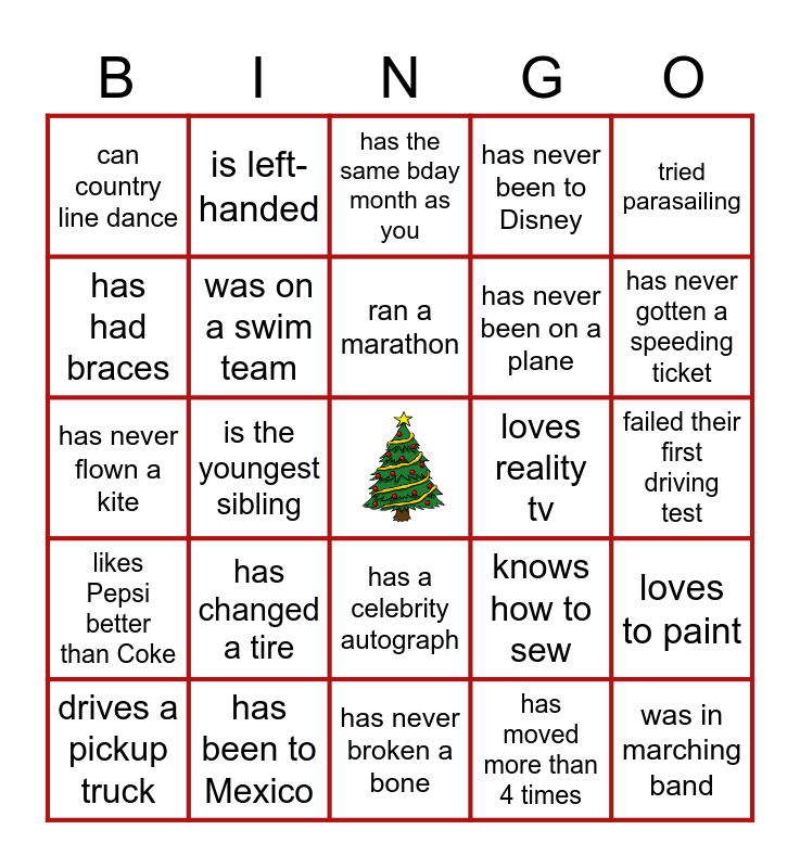 This bingo card has a free space and 29 words: drives a pickup truck, dislikes tomatoes, is the youngest sibling, can speak a foreign language, can country line dance, has the same bday month as you, was on a swim team, has changed a tire, loves reality tv, has been to Mexico, failed their first driving test, was in marching band, has never broken a bone, has moved more than 4 times, has never gotten a speeding ticket, plays a musical instrument, has a celebrity autograph, likes Pepsi better than Coke, tried parasailing, has never flown a kite, knows how to sew, doesn't drink coffee, has never been on a plane, has had braces, has never been to Disney, is left-handed, loves to paint, ran a marathon and has never seen a Star Wars film.