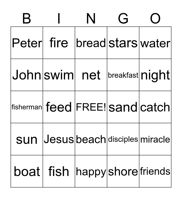 This bingo card has a free space and 24 words: Jesus, fish, net, boat, water, Peter, John, fire, sand, beach, breakfast, fisherman, disciples, miracle, swim, shore, catch, bread, night, feed, friends, sun, stars and happy.