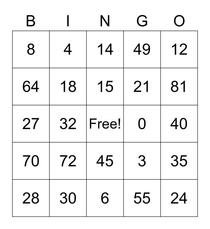 This bingo card has a free space and 24 words: 72, 30, 15, 28, 12, 8, 64, 4, 0, 45, 21, 27, 3, 35, 18, 55, 40, 14, 81, 32, 24, 70, 49 and 6.