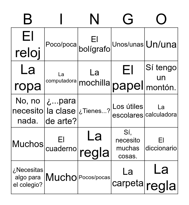 This bingo card has a free space and 24 words: El cuaderno, Mucho, La mochilla, ¿Necesitas algo para el colegio?, Un/una, El reloj, La ropa, Poco/poca, Los útiles escolares, La regla, El papel, No, no necesito nada., Sí, necesito muchas cosas., El diccionario, La computadora, La carpeta, La calculadora, El bolígrafo, Sí tengo un montón., ¿...para la clase de arte?, La regla, Muchos, Unos/unas and Pocos/pocas.