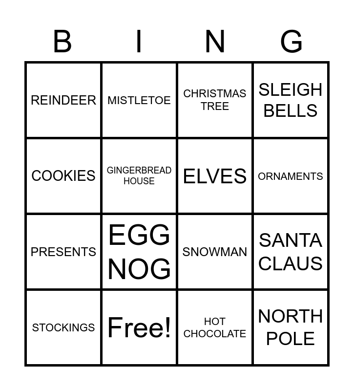 This bingo card has 16 words: Free!, SANTA CLAUS, CHRISTMAS TREE, REINDEER, PRESENTS, MISTLETOE, SNOWMAN, HOT CHOCOLATE, COOKIES, GINGERBREAD HOUSE, STOCKINGS, SLEIGH BELLS, EGG NOG, ORNAMENTS, ELVES and NORTH POLE.