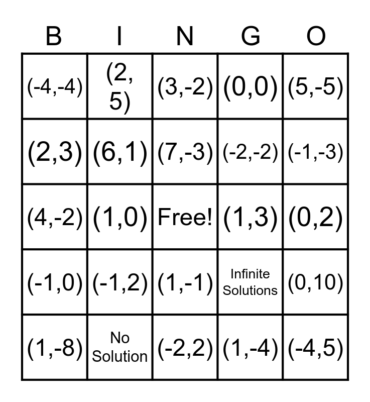 This bingo card has a free space and 24 words: (-1,2), No Solution, (7,-3), (1,-8), (5,-5), (-4,-4), (2,3), (2, 5), (1,3), (1,-1), (-2,-2), (4,-2), Infinite Solutions, (0,10), (6,1), (1,-4), (0,2), (3,-2), (-1,-3), (1,0), (-4,5), (-1,0), (0,0) and (-2,2).