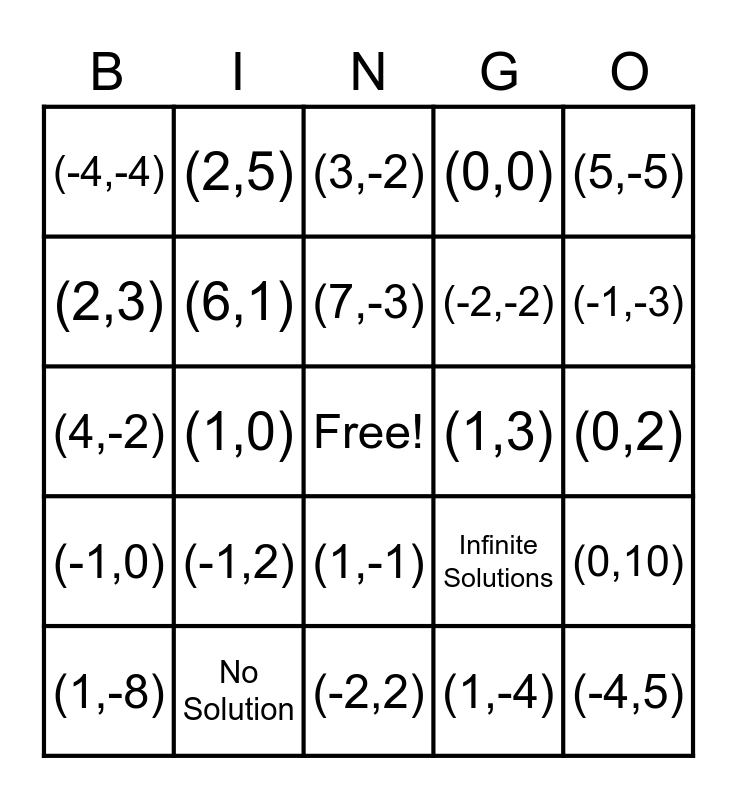 This bingo card has a free space and 24 words: (-1,2), No Solution, (7,-3), (1,-8), (5,-5), (-4,-4), (2,3), (2,5), (1,3), (1,-1), (-2,-2), (4,-2), Infinite Solutions, (0,10), (6,1), (1,-4), (0,2), (3,-2), (-1,-3), (1,0), (-4,5), (-1,0), (0,0) and (-2,2).