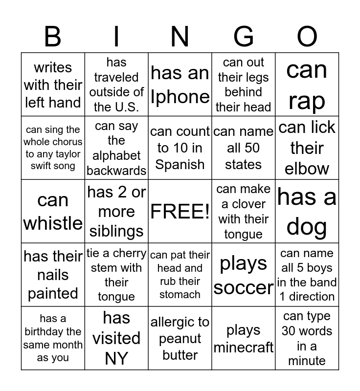 This bingo card has a free space and 24 words: tie a cherry stem with their tongue, has visited NY, can count to 10 in Spanish, has a birthday the same month as you, can rap, writes with their left hand, can sing the whole chorus to any taylor swift song, has traveled outside of the U.S., can make a clover with their tongue, can pat their head and rub their stomach, can name all 50 states, can whistle, plays soccer, can name all 5 boys in the band 1 direction, can say the alphabet backwards, plays minecraft, has a dog, has an Iphone, can lick their elbow, has 2 or more siblings, can type 30 words in a minute, has their nails painted, can out their legs behind their head and allergic to peanut butter.