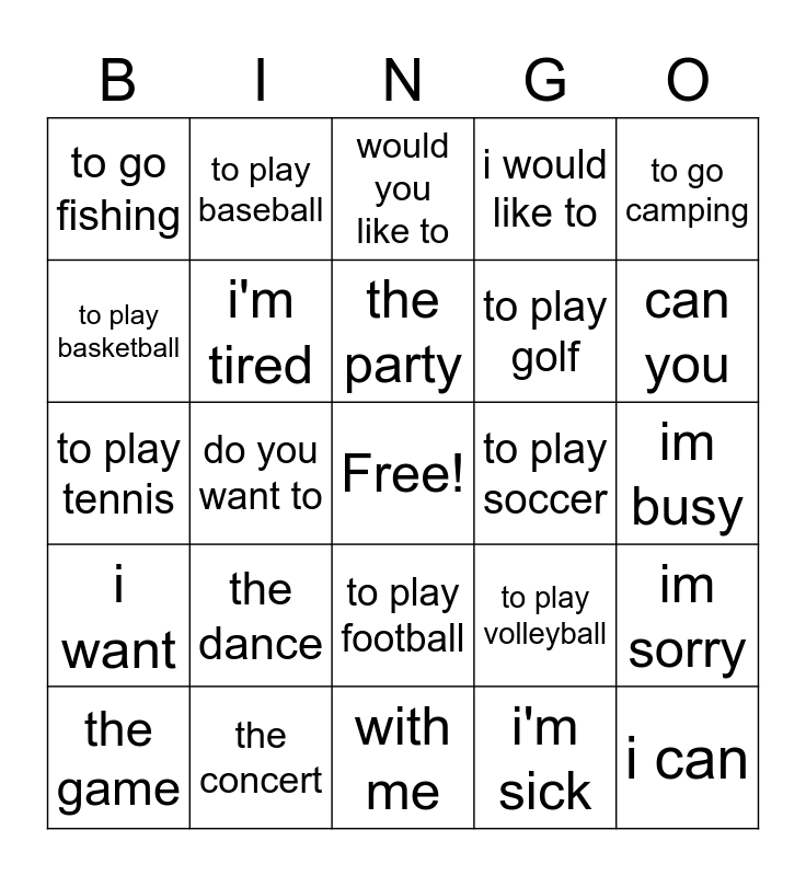 This bingo card has a free space and 24 words: the dance, the concert, the party, the game, to go camping, to go fishing, to play basketball, to play baseball, to play soccer, to play football, to play golf, to play tennis, to play volleyball, im sorry, i'm tired, i'm sick, im busy, would you like to, can you, do you want to, i can, i want, i would like to and with me.