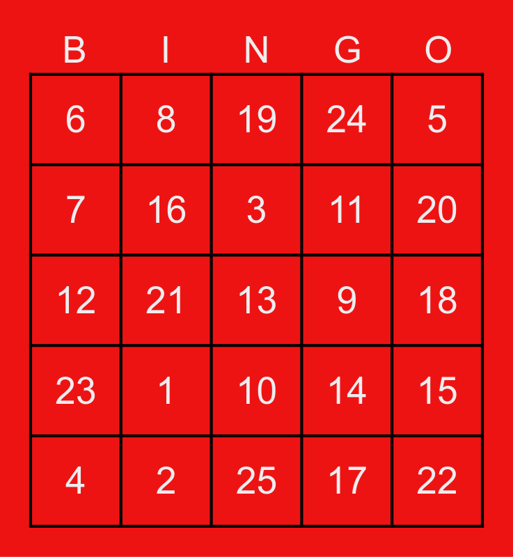 This bingo card has a free space and 24 words: 1, 2, 3, 4, 5, 6, 7, 8, 9, 10, 11, 12, 14, 15, 16, 17, 18, 19, 20, 21, 22, 23, 24 and 25.