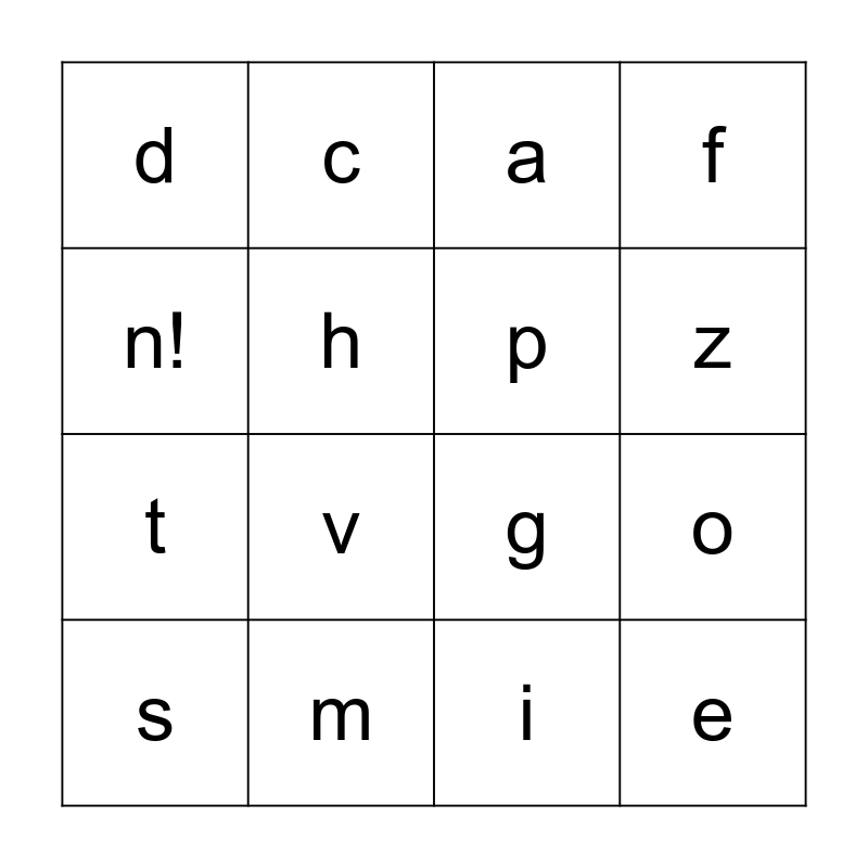 This bingo card has 16 words: m, o, a, d, t, c, g, i, n!, h, s, f, v, z, p and e.