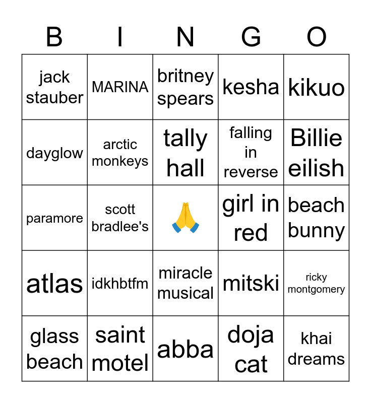 This bingo card has a free space and 24 words: idkhbtfm, saint motel, tally hall, glass beach, kikuo, jack stauber, dayglow, MARINA, girl in red, miracle musical, falling in reverse, paramore, mitski, ricky montgomery, arctic monkeys, doja cat, beach bunny, britney spears, Billie eilish, scott bradlee's, khai dreams, atlas, kesha and abba.