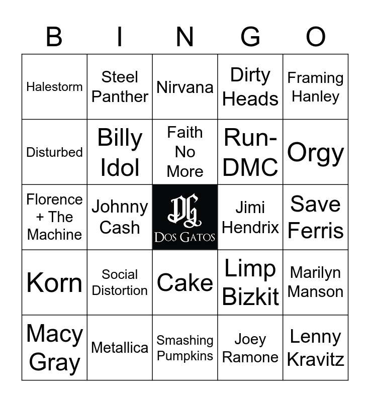 This bingo card has a free space and 35 words: 311, Aerosmith, The Ataris, Billy Idol, Cake, Dirty Heads, Disturbed, Etta James, Faith No More, Five Finger Death Punch, Florence + The Machine, Framing Hanley, Green Day, Gnarls Barkley, Halestorm, Jimi Hendrix, Joey Ramone, Johnny Cash, Korn, Lenny Kravitz, Limp Bizkit, Macy Gray, Marilyn Manson, Metallica, Nirvana, Orgy, Red Hot Chili Peppers, Reel Big Fish, Run-DMC, Save Ferris, Smash Mouth, Smashing Pumpkins, Social Distortion, Steel Panther and Van Halen.