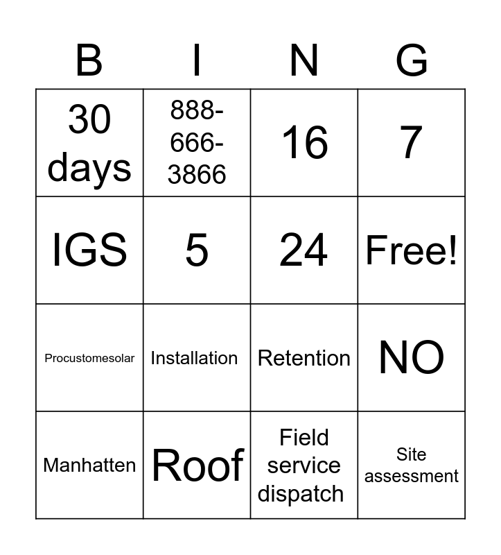 This bingo card has 18 words: Installation, Site assessment, 16, 30 days, Retention, 7, Manhatten, 888-666-3866, Free!, Procustomesolar, Field service dispatch, IGS, NO, 5, 24, Momentum solar energy services, Roof and November.