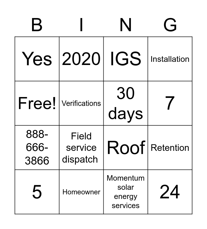 This bingo card has 16 words: Homeowner, Retention, IGS, Yes, 888-666-3866, 2020, Roof, Momentum solar energy services, Free!, Verifications, 5, Installation, Field service dispatch, 7, 30 days and 24.
