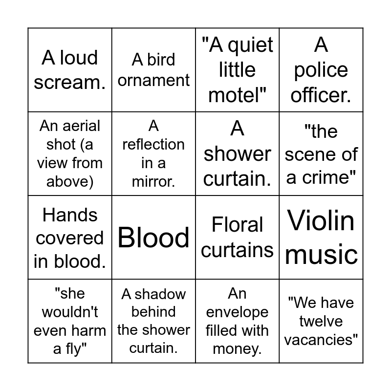 This bingo card has 36 words: Creepy music, Black and white film (monochromatic), Alfred Hitchcock, A shower curtain., The silhouette of a knife., "We have twelve vacancies", "the scene of a crime", stormy weather, An aerial shot (a view from above), A car sinking in water., Violin music, A police officer., "put me down!", A shadow behind the shower curtain., Blood, A loud scream., An eye., The film title., "she wouldn't even harm a fly", "A quiet little motel", An envelope filled with money., A suitcase, A woman driving a car., A hand, A foot, A bird ornament, Floral curtains, A candle, Hands covered in blood., A reflection in a mirror., A man wearing a hat., "That must be my mother", "Is anything wrong?", A man wearing dirty clothes., A woman taking a shower. and A motel..