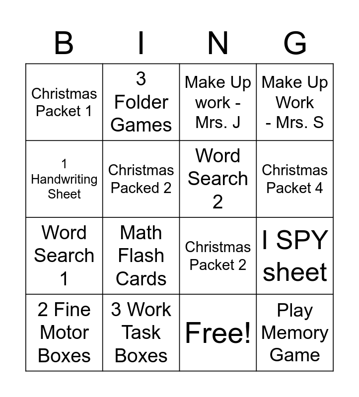 This bingo card has 16 words: 3 Work Task Boxes, I SPY sheet, Make Up work - Mrs. J, Christmas Packet 1, Word Search 1, 3 Folder Games, Christmas Packet 2, Free!, 1 Handwriting Sheet, Christmas Packed 2, 2 Fine Motor Boxes, Make Up Work - Mrs. S, Math Flash Cards, Christmas Packet 4, Word Search 2 and Play Memory Game.