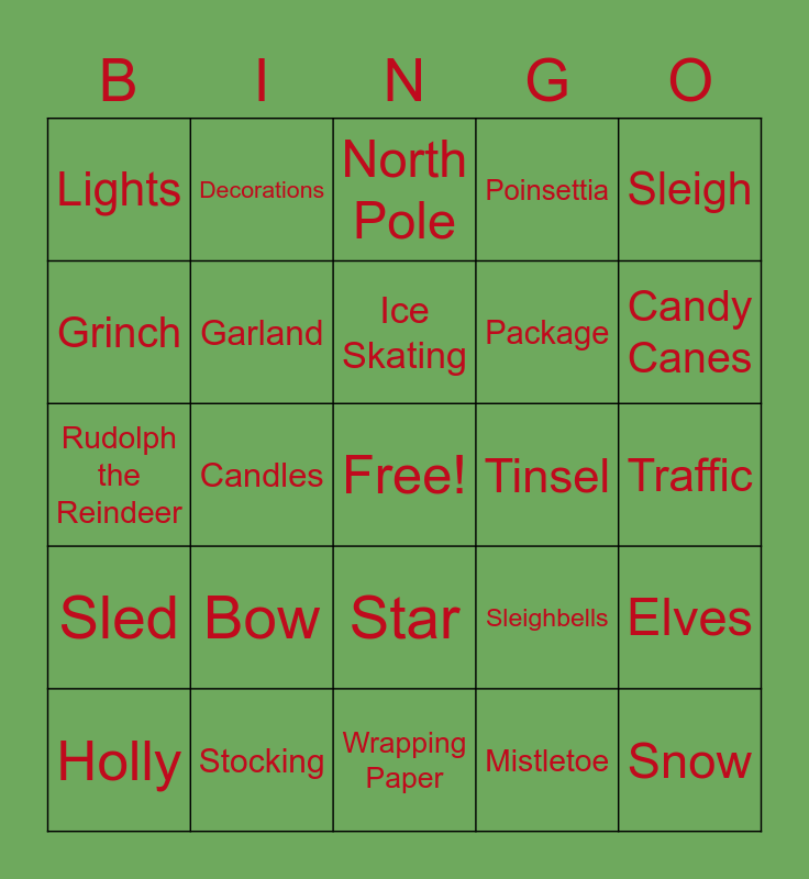 This bingo card has a free space and 44 words: Carol, Snow, Gingerbread, Holly, Mittens, Mistletoe, North Pole, Nutcracker, Sleigh, Stocking, Poinsettia, Tinsel, Star, Bow, Wreath, Wrapping Paper, Frosty the Snowman, Rudolph the Reindeer, Parade, Candy Canes, Decorations, Icicles, Fruitcake, Lights, Tradition, Traffic, Vacation, Snowflakes, Sleighbells, Sled, Pine, Elves, Eggnog, Cards, Candles, Bells, Cider, Fireplace, Ice Skating, Grinch, Package, Sugarplum, Garland and Snow Globe.