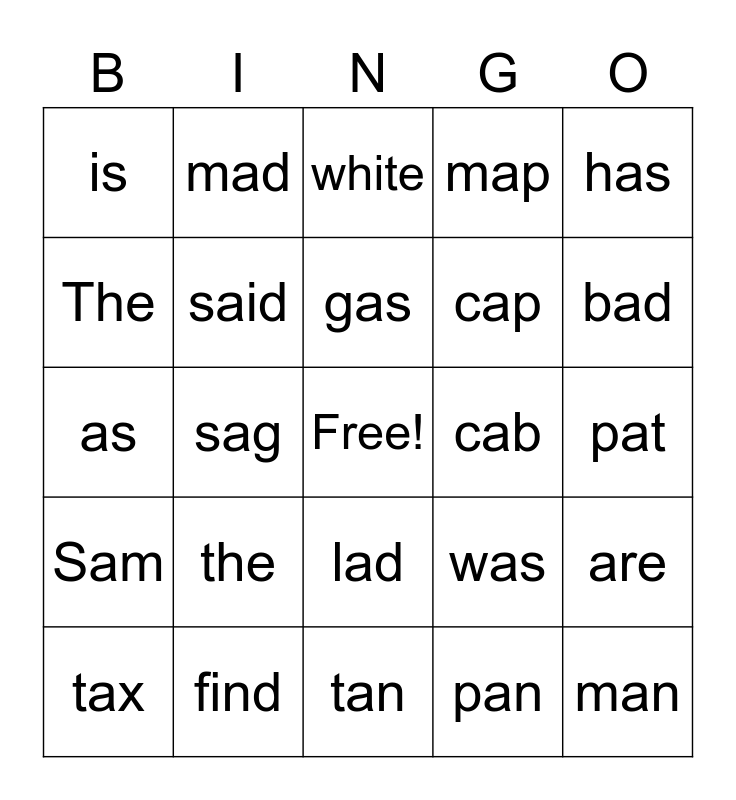 This bingo card has a free space and 24 words: the, find, gas, tax, has, is, The, mad, cab, lad, cap, as, was, are, said, pan, pat, white, bad, sag, man, Sam, map and tan.