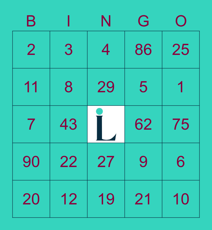 This bingo card has a free space and 25 words: 20, 22, 29, 21, 1, 2, 3, 4, 5, 6, 7, 8, 9, 10, 11, 12, 19, 86, 75, 90, 43, 27, 62, 25 and 77.