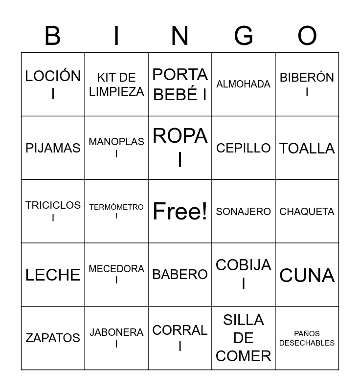 This bingo card has a free space and 48 words: PAÑOS DE TELA I, PAÑOS DESECHABLES, BAÑERA I, CORRAL I, MECEDORA I, KIT DE BAÑO, KIT DE LIMPIEZA, MEDIAS I, PIJAMAS, GORROS, MANOPLAS I, ALMOHADA, CUNA, COBIJA I, EXTRACTOR DE LECHE, PAÑOS HÚMEDOS, ROPA I, SONAJERO, CHUPO, BIBERÓN I, TERMÓMETRO I, SILLA DE COMER, LOCIÓN I, CEPILLO, MOISÉS I, TOALLA, ZAPATOS, JUGUETES, BABERO, LECHE, MÓVIL I, OSITO DE PELUCHE I, ESTERILIZADOR, PAÑALERA I, JABONERA I, ALFOMBRA DE JUEGOS, CAMINADOR, CHAQUETA, CAMBIADOR I, CUENTOS INFANTILES, BODIES I, PAÑALES ECOLÓGICOS, PORTA BEBÉ I, COLCHONETA I, TRICICLOS I, ORGANIZADORES I, JUEGO DE PLATOS and SILLA NIDO.