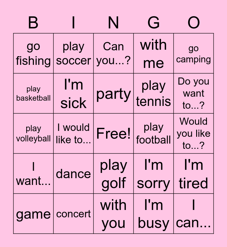 This bingo card has a free space and 24 words: dance, concert, party, game, go camping, go fishing, play basketball, play soccer, play football, play golf, play tennis, play volleyball, I'm sorry, I'm tired, I'm sick, I'm busy, Would you like to...?, Can you...?, Do you want to...?, I would like to..., I can..., I want..., with me and with you.