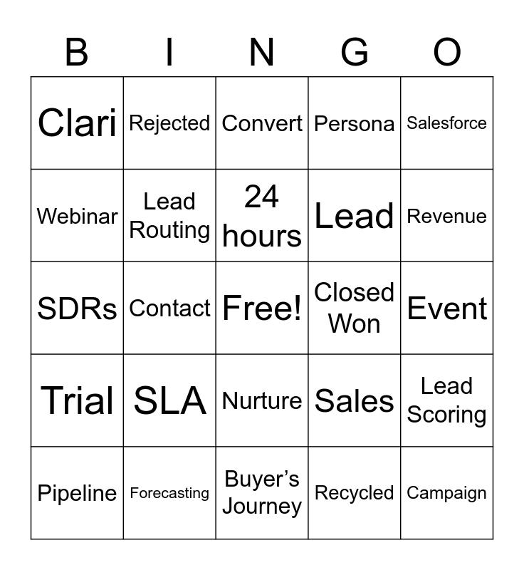 This bingo card has a free space and 38 words: Hot QL, Warm QL, Marketo, Lead Routing, Lead Scoring, SLA, 24 hours, 48 hours, Salesforce, Lead, Contact, Persona, Campaign, Event, Webinar, Trial, Awareness, Convert, Opportunity, Closed Won, Clari, Forecasting, Revenue, Pipeline, Funnel, Buyer’s Journey, SAO, SQO, Stage 0, Engagement, Opt-in, Nurture, Recycled, Rejected, Marketing, Sales, SDRs and Account Executive.