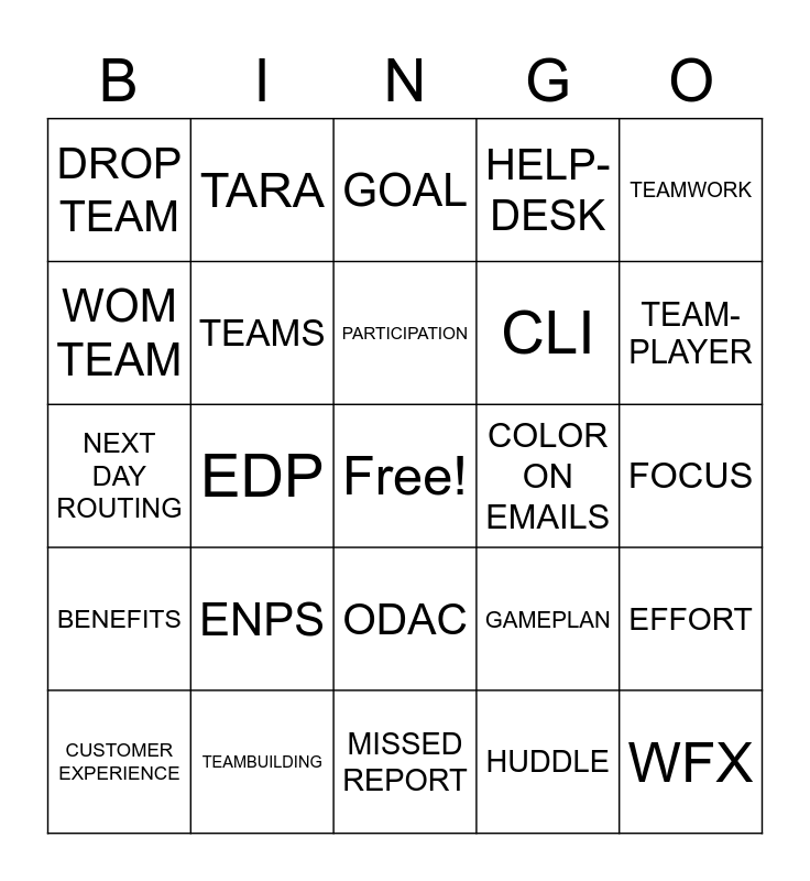 This bingo card has a free space and 24 words: ENPS, TEAMBUILDING, PARTICIPATION, CUSTOMER EXPERIENCE, TEAMWORK, DROP TEAM, WOM TEAM, TARA, COLOR ON EMAILS, ODAC, CLI, NEXT DAY ROUTING, GAMEPLAN, EFFORT, TEAMS, HUDDLE, FOCUS, GOAL, TEAM-PLAYER, EDP, WFX, BENEFITS, HELP-DESK and MISSED REPORT.