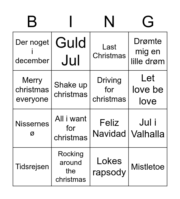 This bingo card has 29 words: Jul det' cool, Jul i Angora, Jul i Valhalla, Lille store verden, Der noget i december, Last Christmas, Driving for christmas, Allertiders jul, Rocking around the christmas, Jesus og Josefine, Lokes rapsody, Tidsrejsen, Gnags julesang, Julefeber, All i want for christmas, Jul i Vesterbro, Baby it's cold outside, Mistletoe, Merry christmas everyone, Feliz Navidad, Mary's boy child, Den jeg ikke vil have, Nissernes ø, Shake up christmas, Drømte mig en lille drøm, Guld Jul, Jule unz, Let love be love and En rigtig drengejul.