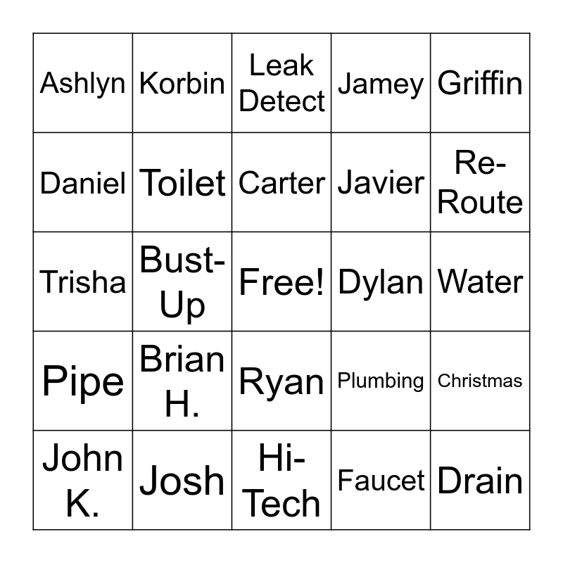 This bingo card has a free space and 24 words: Brian H., Josh, Carter, John K., Griffin, Ashlyn, Daniel, Korbin, Dylan, Ryan, Javier, Trisha, Plumbing, Christmas, Toilet, Faucet, Water, Leak Detect, Re-Route, Bust-Up, Drain, Pipe, Jamey and Hi-Tech.