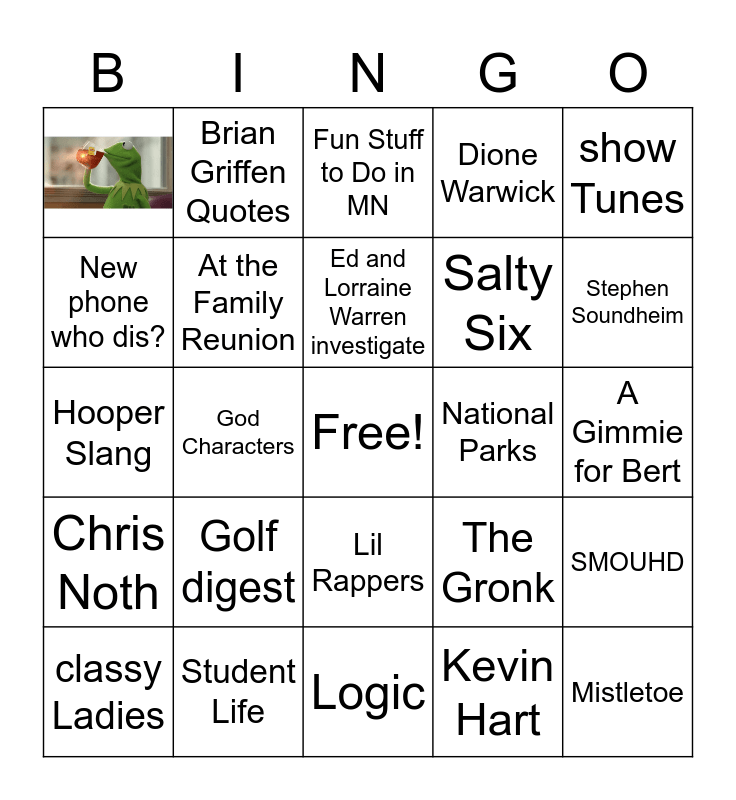 This bingo card has 1 images, a free space and 23 words: Golf digest, Student Life, Ed and Lorraine Warren investigate, classy Ladies, show Tunes, New phone who dis?, Brian Griffen Quotes, National Parks, Lil Rappers, Salty Six, Hooper Slang, The Gronk, SMOUHD, At the Family Reunion, Kevin Hart, A Gimmie for Bert, Fun Stuff to Do in MN, Stephen Soundheim, God Characters, Mistletoe, Chris Noth, Dione Warwick and Logic.