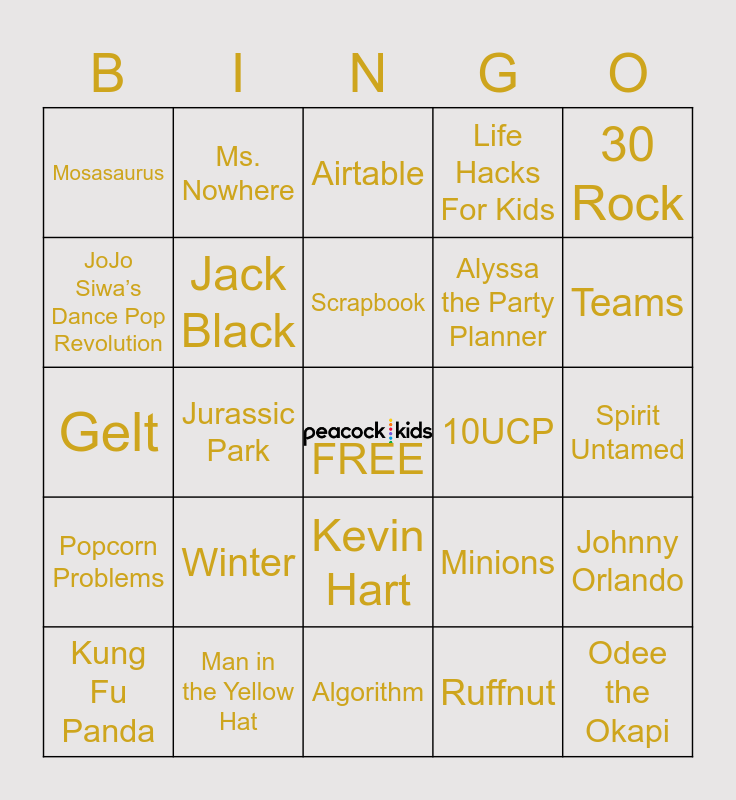 This bingo card has a free space and 100 words: Lucky, Pru, Spirit Untamed, Shrek, Poppy, Branch, Gabby, Pandy, Catrat, Cakey, Pillow Cat, Colossal Cranium, Curious George, Man in the Yellow Hat, Mercat, Tiny Diamond, Alyssa the Party Planner, Fifi: Cat Therapist, Queen Barb, Boss Baby, Hiccup, Toothless, Astrid, Donkey, Peacock, 10UCP, 30 Rock, Minions, Bumpy, Blue, Jurassic Park, Mosasaurus, T-Rex, Velociraptor, Ruffnut, Scrapbook, Johnny Orlando, Santa, Rudolph, Snowman, Menorah, Eight Crazy Nights, Gelt, Out of office, Teams, Airtable, Slack, Outlook, YouTube, Algorithm, Thumbnail, Metadata, Times Square, What The Past?, Weird in the Wild, News That Doesn’t Stink, Trolls Scrapbook Stories, Challenge the Champ, Olympic Dreamers, Life Hacks For Kids, Crazy Solutions to Small Problems, Crack The Case, Don’t Forget Your Underwear, Spa Science, How To Survive Jurassic World, Spine-Chilling Stories, Spirit Toy Play, Livestream, Symphony, Solstice, Kwanzaa, Winter, The Flock, Baby Races, Draw My Dream, Create the Escape, Backyard Blowout, JoJo Siwa’s Dance Pop Revolution, Gloria, Marty, Melman, Odee the Okapi, Famous 5eva, Kevin Hart, Tony Toretto, Ms. Nowhere, Tina Templeton, Squishies, Babble Bop, Popcorn Problems, Captain Underpants, George Beard, Harold Hutchins, Kung Fu Panda, Jack Black, Bliss Brigade, 30 Rock, Jeff Shell, Matt Strauss and Rutherford Falls.