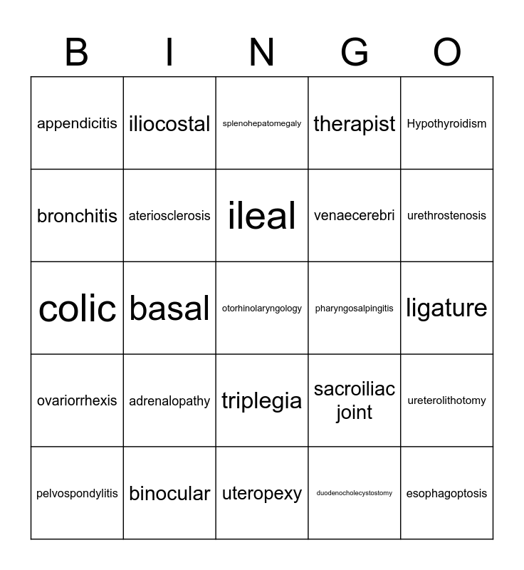 This bingo card has a free space and 24 words: adrenalopathy, binocular, ileal, pelvospondylitis, Hypothyroidism, appendicitis, bronchitis, iliocostal, pharyngosalpingitis, triplegia, venaecerebri, colic, sacroiliac joint, ureterolithotomy, ateriosclerosis, duodenocholecystostomy, ligature, splenohepatomegaly, urethrostenosis, basal, esophagoptosis, ovariorrhexis, therapist and uteropexy.