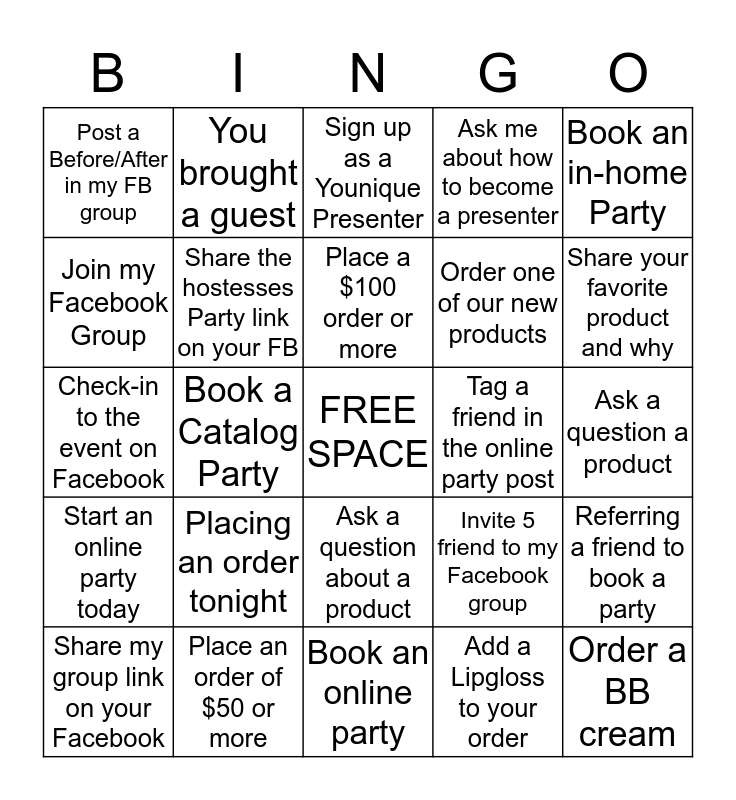 This bingo card has a free space and 24 words: Placing an order tonight, Place an order of $50 or more, Place a $100 order or more, Share my group link on your Facebook, Book an in-home Party, Post a Before/After in my FB group, Join my Facebook Group, You brought a guest, Tag a friend in the online party post, Ask a question about a product, Order one of our new products, Check-in to the event on Facebook, Invite 5 friend to my Facebook group, Referring a friend to book a party, Share the hostesses Party link on your FB, Add a Lipgloss to your order, Ask a question a product, Sign up as a Younique Presenter, Share your favorite product and why, Book a Catalog Party, Order a BB cream, Start an online party today, Ask me about how to become a presenter and Book an online party.