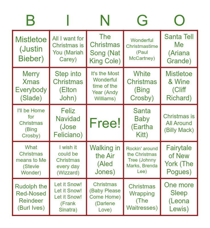 This bingo card has a free space and 50 words: Merry Christmas Everyone (Shakin' Stevens), One more Sleep (Leona Lewis), It's beginning to look a lot like Christmas (Michael Buble), Christmas (Baby Please Come Home) (Darlene Love), I wish it could be Christmas every day (Wizzard), Last Christmas (Wham), All I want for Christmas is You (Mariah Carey), Driving Home for Christmas (Chris Rea), Merry Xmas Everybody (Slade), Do they know it's CHristmas (Band Aid), Step into Christmas (Elton John), Wonderful Christmastime (Paul McCartney), Fairytale of New York (The Pogues), Rockin' around the Christmas Tree (Johnny Marks, Brenda Lee), Happy Xmas (War is over) (John Lennon), Sleigh Ride (The Ronettes), It's the Most Wonderful time of the Year (Andy Williams), Santa Baby (Eartha Kitt), Underneath the Tree (Kelly Clarkson), Santa Tell Me (Ariana Grande), Feliz Navidad (Jose Feliciano), Christmas Wrapping (The Waitresses), Mistletoe (Justin Bieber), White Christmas (Bing Crosby), Frosty the Snowman (The Ronettes), Christmas Time (The Darkness), Mistletoe & Wine (Cliff Richard), Baby it's Cold Outside (Ella Fitzgerald etc.), The Christmas Song (Nat King Cole), Walking in the Air (Aled Jones), Deck the Halls (Nat King Cole), I saw Mommy Kissing Santa Clause (The Jackdon 5), Silent Night (Bing Crosby), Jingle Bell Rock (Bobby Helms), Let it Snow! Let it Snow! Let it Snow! (Frank Sinatra), Winter Wonderland (Bring Crosby), Christmas Lights (Coldplay), Lonely this Christmas (Mud), Holly Jolly CHristmas (Michael Buble), Christmas is All Around (Billy Mack), The Holly & the Ivy (Trad.), Away in a Manger (Trad.), Have Yourself a Merry LIttle Christmas (Judy Garland), Santa Clause is coming to Town (Jackson 5), Rudolph the Red-Nosed Reindeer (Burl Ives), I'll be Home for Christmas (Bing Crosby), Twelve Days of Christmas (Trad.), Let it Go (Frozen), What Christmas means to Me (Stevie Wonder) and Jingle Bells (Trad.).