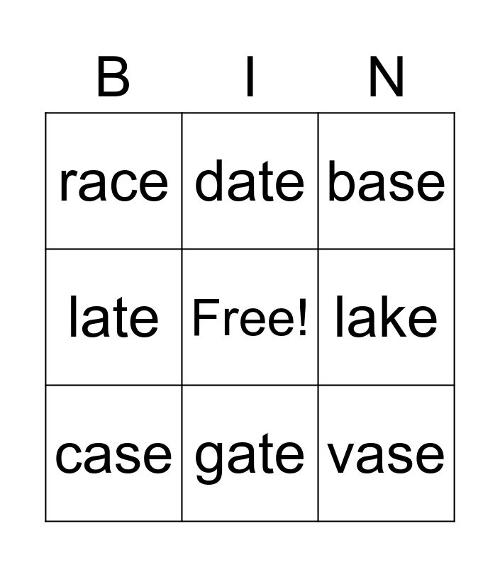 This bingo card has a free space and 12 words: face, cake, vase, lake, date, base, gate, vase, race, late, case and lace.
