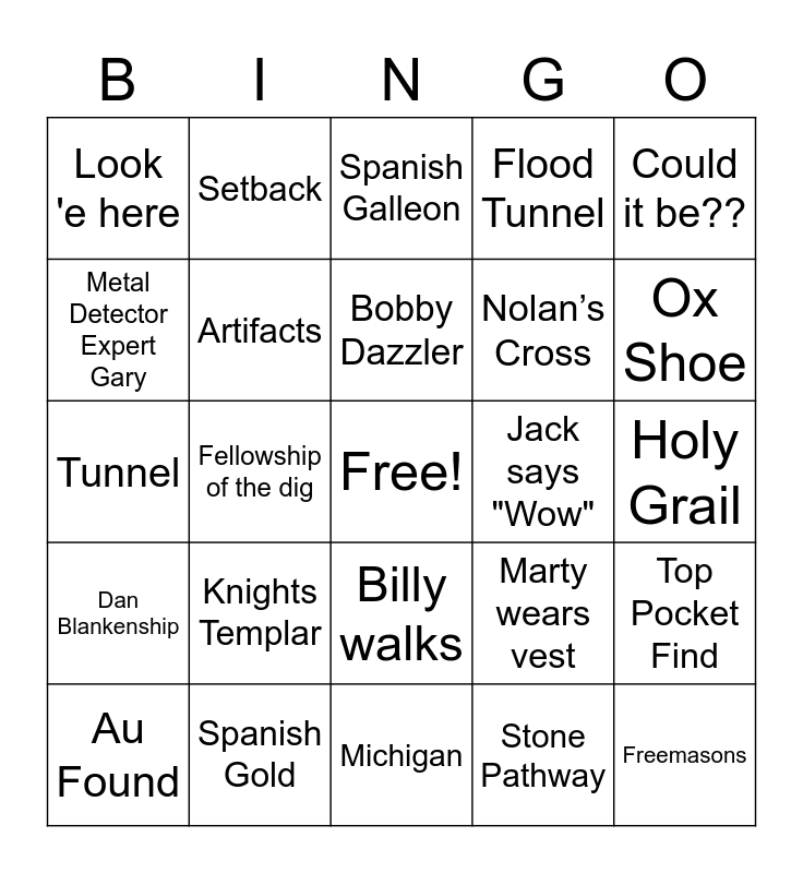 This bingo card has a free space and 39 words: 10-X, Arcadia Univ, Archaeologist, Artifacts, Au Found, Billy walks, Bobby Dazzler, C-1, Could it be??, Dan Blankenship, Fellowship of the dig, Flood Tunnel, Freemasons, Holy Grail, Jack says "Wow", Knights Templar, Lead Cross, Look 'e here, Marty is Skeptical!, Marty wears vest, Metal Detector Expert Gary, Michigan, Nolan’s Cross, Ox Shoe, Permit, Peter Fornetti, Rick Cries, Rose Gold, Samuel Ball, Setback, Shaft, Smith’s Cove, Spanish Galleon, Spanish Gold, Stone Pathway, The Swamp, Top Pocket Find, Tunnel and War Room.