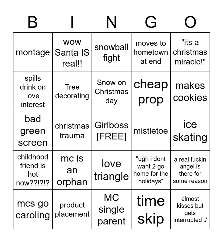 This bingo card has a free space and 36 words: Christmas themed character names, Cheats on Fiance/Partner, Church Scene, Tree decorating, "ugh i dont want 2 go home for the holidays", childhood friend is hot now??!?!?, Snow on Christmas day, Actual fuckign santa shows up, "its a christmas miracle!", Parent/s died on christmas, christmas trauma, moves to hometown at end, "you cant shut down the ___!", mistletoe, makes cookies, montage, flashback, mc is an orphan, almost kisses but gets interrupted :/, snowball fight, ice skating, a real fuckin angel is there for some reason, product placement, mcs go caroling, MC single parent, wow Santa IS real!!, bad green screen, someone gets amnesia, cheap prop, spills drink on love interest, awkward pause, misinterpretation of an overheard conversation, time skip, love triangle, snow ruins plans and hospital scene.