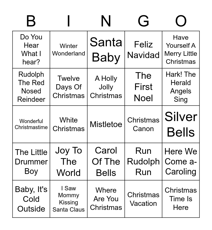 This bingo card has 68 words: All I Want For Christmas Is You, Mistletoe, It's Beginning To Look A Lot Like Christmas, Rockin' Around The Christmas Tree, Jingle Bell Rock, It's The Most Wonderful Time Of The Year, Winter Wonderland, Let It Snow!, A Holly Jolly Christmas, Last Christmas, Carol Of The Bells, The Christmas Song, Silver Bells, Have Yourself A Merry Little Christmas, Sleigh Ride, Rudolph The Red Nosed Reindeer, White Christmas, Do You Hear What I hear?, Blue Christmas, Joy To The World, The First Noel, Run Rudolph Run, The Little Drummer Boy, Christmas Time Is Here, Mele Kalikimaka, Mistletoe And Holly, The Man With The Bag, Do They Know It's Christmas?, Here We Come a-Caroling, All I want For Christmas, Santa Baby, What Child Is This, God Rest Ye Merry Gentlemen, Happy Xmas, Feliz Navidad, I'll Be Home For Christmas, Here Comes Santa Claus, Baby, It's Cold Outside, Hark! The Herald Angels Sing, Wonderful Christmastime, Little Saint Nick, O Tannenbaum, Twelve Days Of Christmas, Fairytale of New York, Mary's Boy Child, Silent Night, Grandma Got Run Over By A Reindeer, Oh Come, Oh Come Emmanuel, Christmas Canon, I Saw Mommy Kissing Santa Claus, Frosty The Snowman, Let It Be Christmas, I Want A Hippopotamus For Christmas, Where Are You Christmas, Christmas (Baby Please Come Home), Cold December Night, Christmas Vacation, Christmas Eve, The Chipmunk Song, Underneath The Tree, Happy Holiday, Dance of the Sugar Plum Fairy, The Christmas Shoes, Mary Did You Know?, Hallelujah, Please Come Home For Christmas, Oh Holy Night and Oh Come All Ye Faithful.