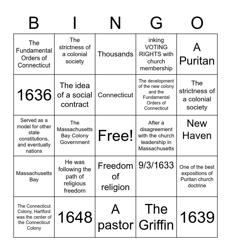 This bingo card has a free space and 24 words: He was following the path of religious freedom, 1648, Connecticut, The Connecticut Colony, Hartford was the center of the Connecticut Colony, A Puritan, The Fundamental Orders of Connecticut, 1636, The strictness of a colonial society, After a disagreement with the church leadership in Massachusetts, Freedom of religion, The development of the new colony and the Fundamental Orders of Connecticut, Served as a model for other state constitutions, and eventually nations, 9/3/1633, One of the best expositions of Puritan church doctrine, The idea of a social contract, The Griffin, New Haven, Thousands, The strictness of a colonial society, The Massachusetts Bay Colony Government, 1639, Massachusetts Bay, inking VOTING RIGHTS with church membership and A pastor.