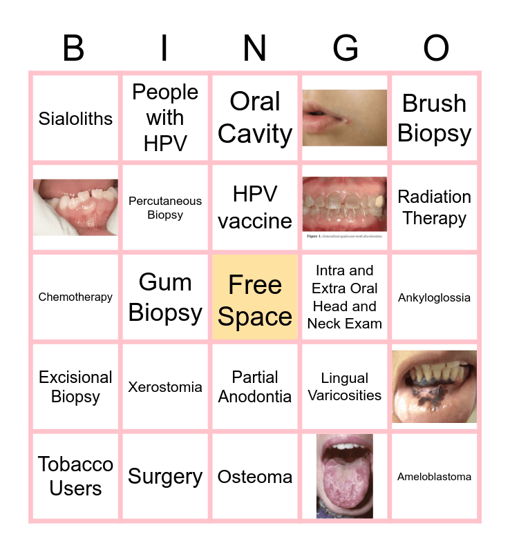 This bingo card has 7 images, a free space and 26 words: $173,520, 3, Gum Biopsy, Incisional Biopsy, Excisional Biopsy, Percutaneous Biopsy, Brush Biopsy, Tobacco Users, People with HPV, Heavy Alcohol Consumers, HPV vaccine, Oral Cavity, Oral ID, Velscope, Intra and Extra Oral Head and Neck Exam, Radiation Therapy, Surgery, Chemotherapy, Xerostomia, Lingual Varicosities, Partial Anodontia, Abscess, Sialoliths, Ankyloglossia, Osteoma and Ameloblastoma.