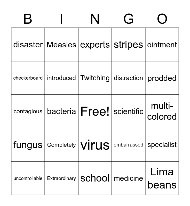 This bingo card has a free space and 24 words: Completely, Extraordinary, Twitching, uncontrollable, ointment, disaster, checkerboard, Measles, scientific, virus, distraction, contagious, embarrassed, specialist, introduced, medicine, multi-colored, experts, prodded, bacteria, Lima beans, fungus, stripes and school.