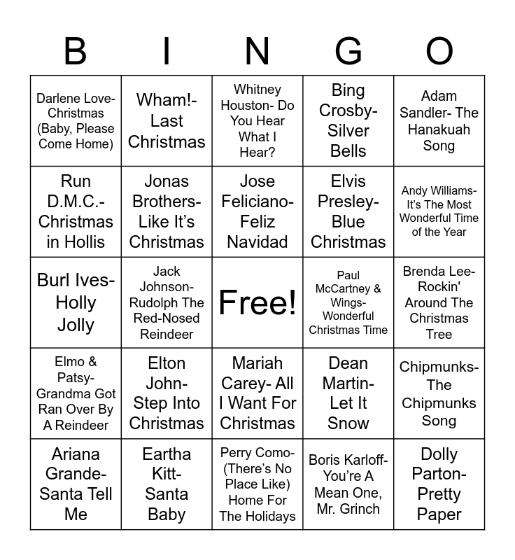 This bingo card has a free space and 26 words: Mariah Carey- All I Want For Christmas, Boris Karloff- You’re A Mean One, Mr. Grinch, Jose Feliciano- Feliz Navidad, Eartha Kitt- Santa Baby, Adam Sandler- The Hanakuah Song, Darlene Love- Christmas (Baby, Please Come Home), Run D.M.C.- Christmas in Hollis, Wham!- Last Christmas, Brenda Lee- Rockin' Around The Christmas Tree, Dean Martin- Let It Snow, Elvis Presley- Blue Christmas, Burl Ives- Holly Jolly, Chipmunks- The Chipmunks Song, Ariana Grande- Santa Tell Me, Jack Johnson- Rudolph The Red-Nosed Reindeer, James Brown- Santa Claus Go Straight To The Ghetto, Bing Crosby- Silver Bells, Elmo & Patsy- Grandma Got Ran Over By A Reindeer, Whitney Houston- Do You Hear What I Hear?, Dolly Parton- Pretty Paper, Andy Williams- It’s The Most Wonderful Time of the Year, Perry Como- (There’s No Place Like) Home For The Holidays, Paul McCartney & Wings- Wonderful Christmas Time, Elton John- Step Into Christmas, Jonas Brothers- Like It’s Christmas and Judy Garland- A Merry Little Christmas.