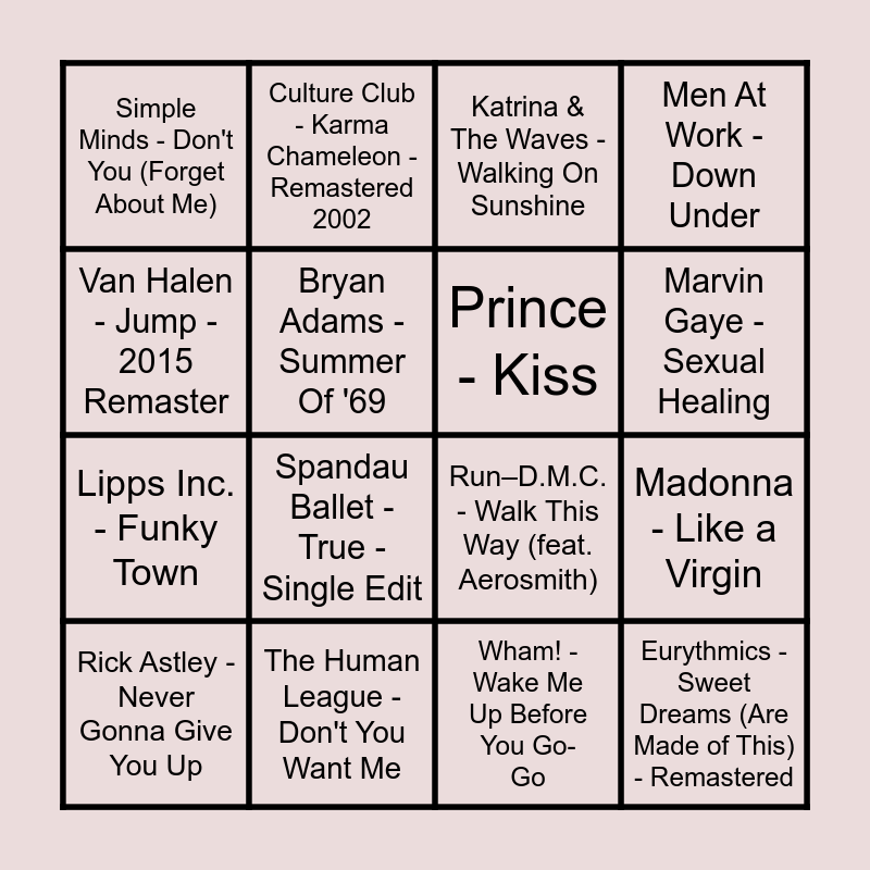 This bingo card has 54 words: a-ha - Take on Me, Eurythmics - Sweet Dreams (Are Made of This) - Remastered, TOTO - Africa, Journey - Don't Stop Believin', Tears For Fears - Everybody Wants To Rule The World, Kenny Loggins - Footloose - From "Footloose" Soundtrack, Men At Work - Down Under, Soft Cell - Tainted Love, Bryan Adams - Summer Of '69, Whitney Houston - I Wanna Dance with Somebody (Who Loves Me), Simple Minds - Don't You (Forget About Me), Queen - Under Pressure, Cyndi Lauper - Girls Just Want to Have Fun, Daryl Hall & John Oates - You Make My Dreams (Come True), Starship - We Built This City, Michael Jackson - Beat It, Rick Astley - Never Gonna Give You Up, Lipps Inc. - Funky Town, Kim Carnes - Bette Davis Eyes, Wham! - Wake Me Up Before You Go-Go, The Buggles - Video Killed The Radio Star, New Order - Blue Monday, The Human League - Don't You Want Me, Van Halen - Jump - 2015 Remaster, UB40 - Red Red Wine, Culture Club - Karma Chameleon - Remastered 2002, Belinda Carlisle - Heaven Is a Place on Earth, Philip Bailey - Easy Lover, Fleetwood Mac - Everywhere, The Proclaimers - I'm Gonna Be (500 Miles), Michael Jackson - Thriller - 2003 Edit, Survivor - Eye of the Tiger, Paul Simon - You Can Call Me Al, Billy Joel - Uptown Girl, Katrina & The Waves - Walking On Sunshine, Lionel Richie - All Night Long (All Night), Run–D.M.C. - Walk This Way (feat. Aerosmith), Dead Or Alive - You Spin Me Round (Like a Record), INXS - Need You Tonight, Prince - Kiss, Don Henley - The Boys Of Summer, Depeche Mode - Just Can't Get Enough, Men Without Hats - The Safety Dance, Cameo - Word Up, Kim Wilde - Kids In America, The B-52's - Love Shack, ABBA - Super Trouper, Womack & Womack - Teardrops - Single Version, Marvin Gaye - Sexual Healing, Madonna - Like a Virgin, Spandau Ballet - True - Single Edit, George Michael - Faith - Remastered, The Harmony Group - Electric Avennue and The Bangles - Walk Like an Egyptian.
