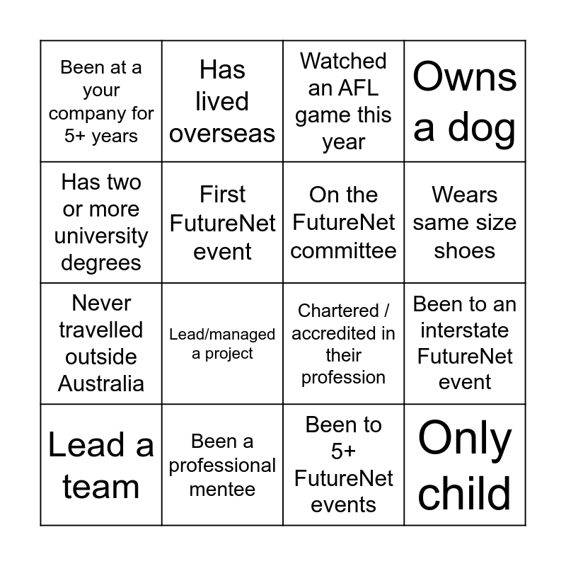 This bingo card has 44 words: Free!, Lead a team, Has a side business, Not originally from Melbourne, Has green eyes, Has an uncommon hobby, Watched an AFL game this year, From a country / rural town, Has two or more university degrees, Joined a new company during lockdown, Owns a dog, Been a professional mentee, Is a vegan/vegetarian, Prefers to work alone, Has a scar, Has blue eyes, Finished work once past 10pm, Chartered / accredited in their profession, Plays a social sport, Lead/managed a project, Has lived overseas, Has worked professionally in a different industry, Been on TV, Been at a your company for 5+ years, Been a professional mentor, Been to 5+ FutureNet events, Is a project manager, Prefers to be in the office than WFH, Plays a sport, Only child, Been at a your company for <1 year, Doesn't drink coffee, Has broken over 3 bones, Has brown eyes, Been to an interstate FutureNet event, Has 3+ siblings, Taken a nap during work hours while WFH, On an internal work committee, Wears same size shoes, First FutureNet event, Never travelled outside Australia, Has a business card, On the FutureNet committee and Owns a cat.