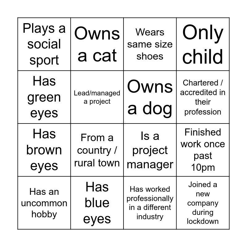 This bingo card has 43 words: On an internal work committee, Has an uncommon hobby, Is a vegan/vegetarian, Has a business card, Has two or more university degrees, Plays a sport, Wears same size shoes, Been at a your company for <1 year, Has green eyes, First FutureNet event, Only child, Has blue eyes, Been a professional mentee, Not originally from Melbourne, Never travelled outside Australia, On the FutureNet committee, Been to an interstate FutureNet event, Is a project manager, Lead a team, From a country / rural town, Owns a cat, Been a professional mentor, Watched an AFL game this year, Plays a social sport, Has a scar, Has worked professionally in a different industry, Been at a your company for 5+ years, Has lived overseas, Been to 5+ FutureNet events, Joined a new company during lockdown, Prefers to work alone, Has a side business, Has 3+ siblings, Finished work once past 10pm, Taken a nap during work hours while WFH, Has broken over 3 bones, Doesn't drink coffee, Chartered / accredited in their profession, Lead/managed a project, Has brown eyes, Prefers to be in the office than WFH, Owns a dog and Been on TV.
